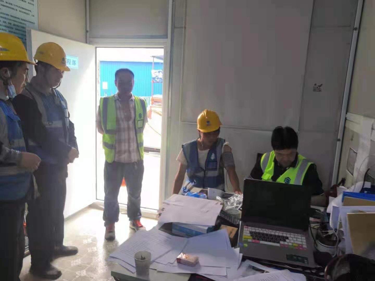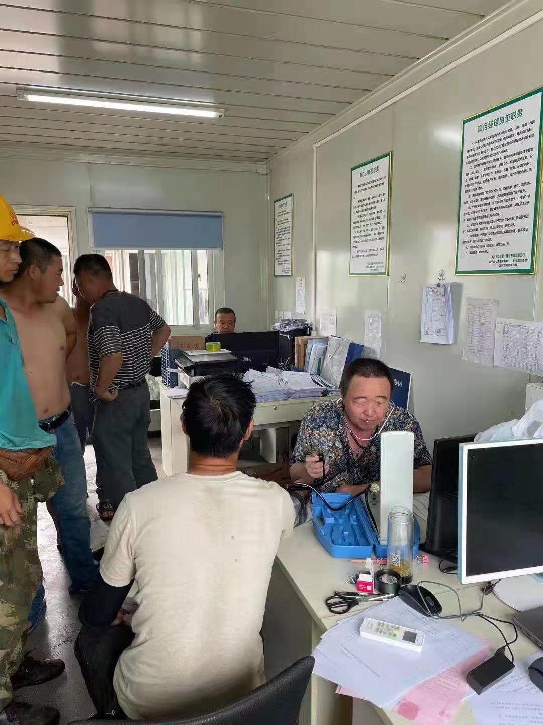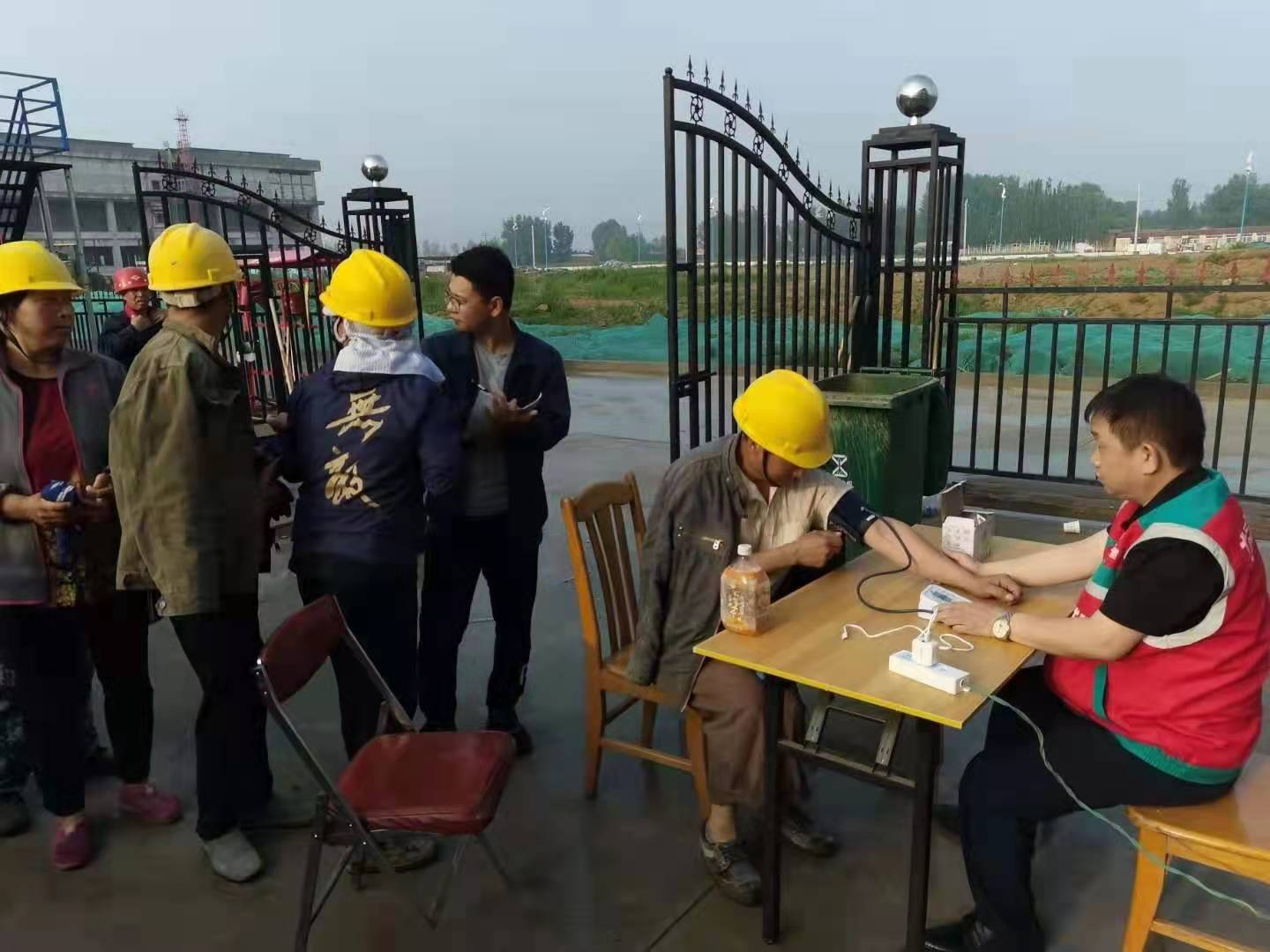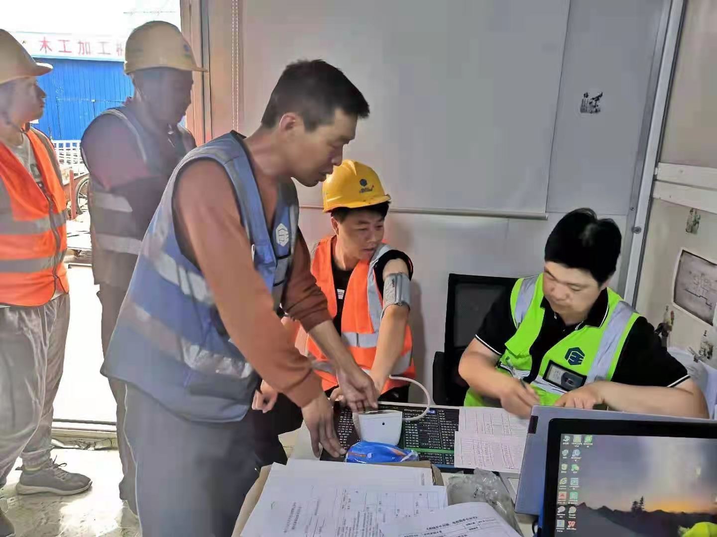 內(nèi)蒙東方國(guó)信項(xiàng)目,項(xiàng)目書記利用開早班會(huì)時(shí)間,親自給每位工人量血壓做記錄