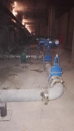 .初沉池設(shè)備間安裝。設(shè)備間長度為288米,共17臺排泥泵,泵體及管道排布均在一條直線。