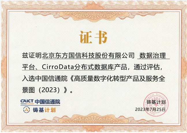 近日,中國信通院“2023 數(shù)字生態(tài)發(fā)展大會(huì)”暨中國信通院“鑄基計(jì)劃”發(fā)布了《高質(zhì)量數(shù)字化轉(zhuǎn)型產(chǎn)品及服務(wù)全景圖(2023)》。東方國信數(shù)據(jù)治理平臺(tái)及CirroData分布式數(shù)據(jù)庫產(chǎn)品成功入選技術(shù)開發(fā)、數(shù)據(jù)分析、數(shù)據(jù)治理3個(gè)數(shù)字化圖景并獲得證書。